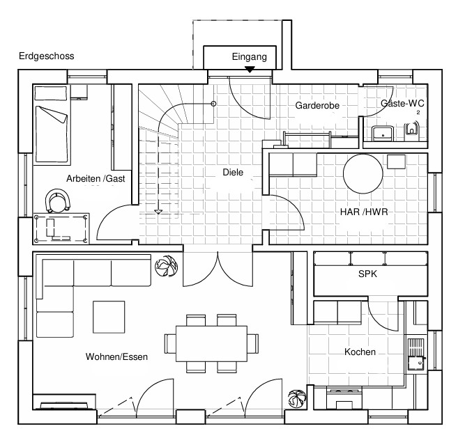 Einfamilienhaus mit Walmdach, Satteldach, Flachdach
